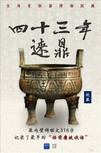 四十三年逨鼎共出土10件,大小不一。這是體積最大的一件,器內(nèi)壁鑄有銘文316字,講述了周宣王43年,逨被提拔為官司歷人,相當于現(xiàn)在的監(jiān)察官。周天子告誡逨要施政謹慎、依法處罰、明辨是非、廉潔從政。這與《周禮》中的“六廉”——廉善、廉能、廉敬、廉法、廉正、廉辨相互呼應。