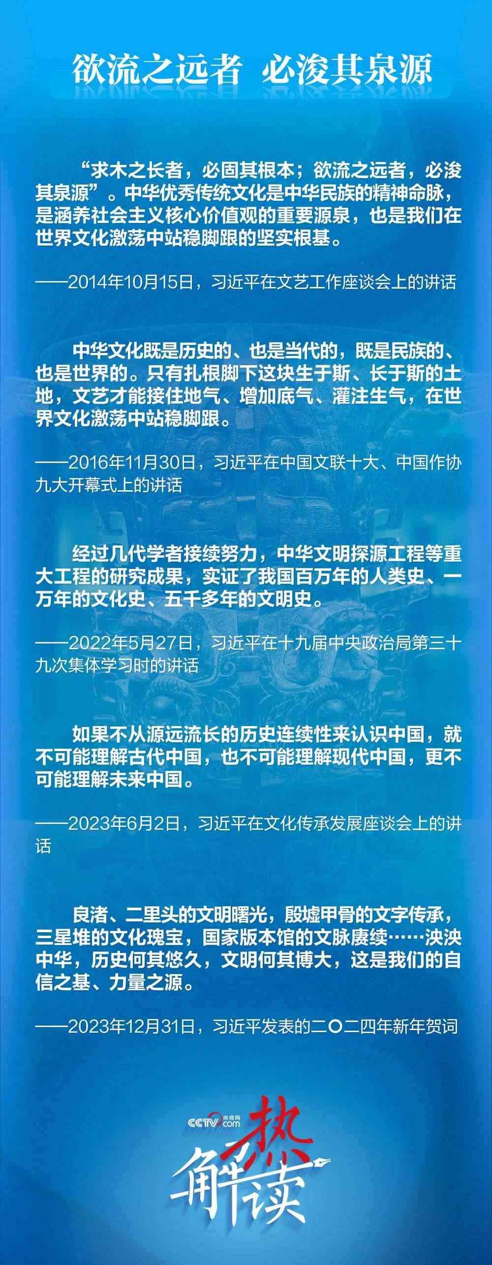 一件件文物、一處處文化古跡、一項項文化藝術,串連起中華民族的文化史,蘊藏著“何以中國”的文化力量。總書記對中華文明之源的關注,彰顯的正是他對推動文化繁榮、建設文化強國的深刻思考和文化自信。