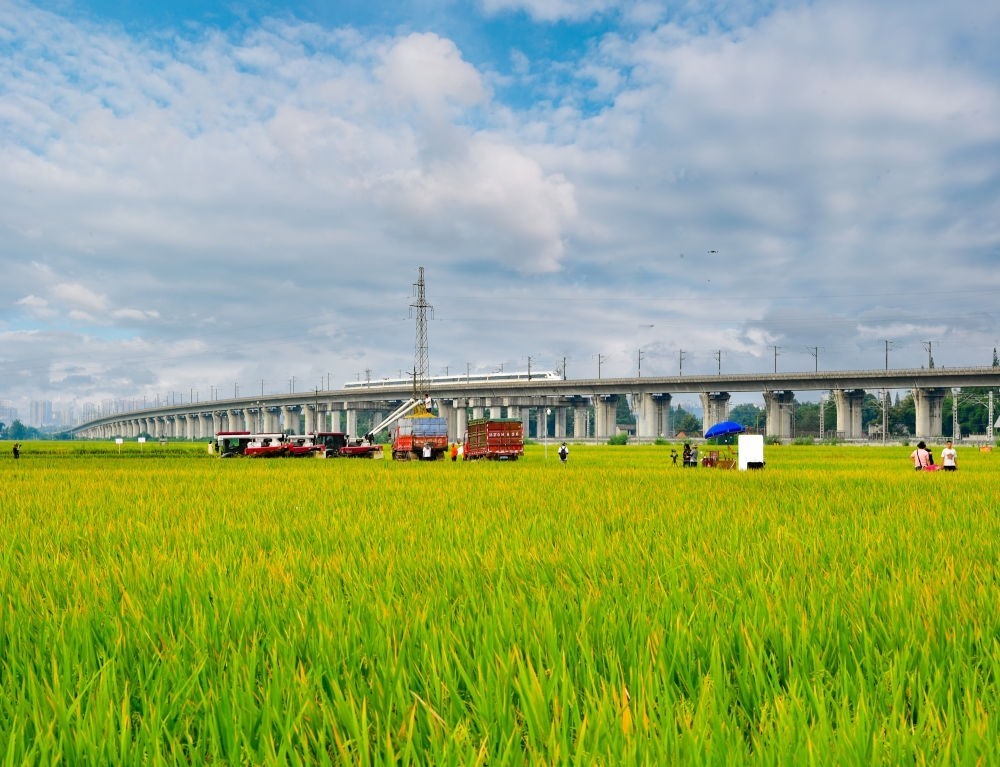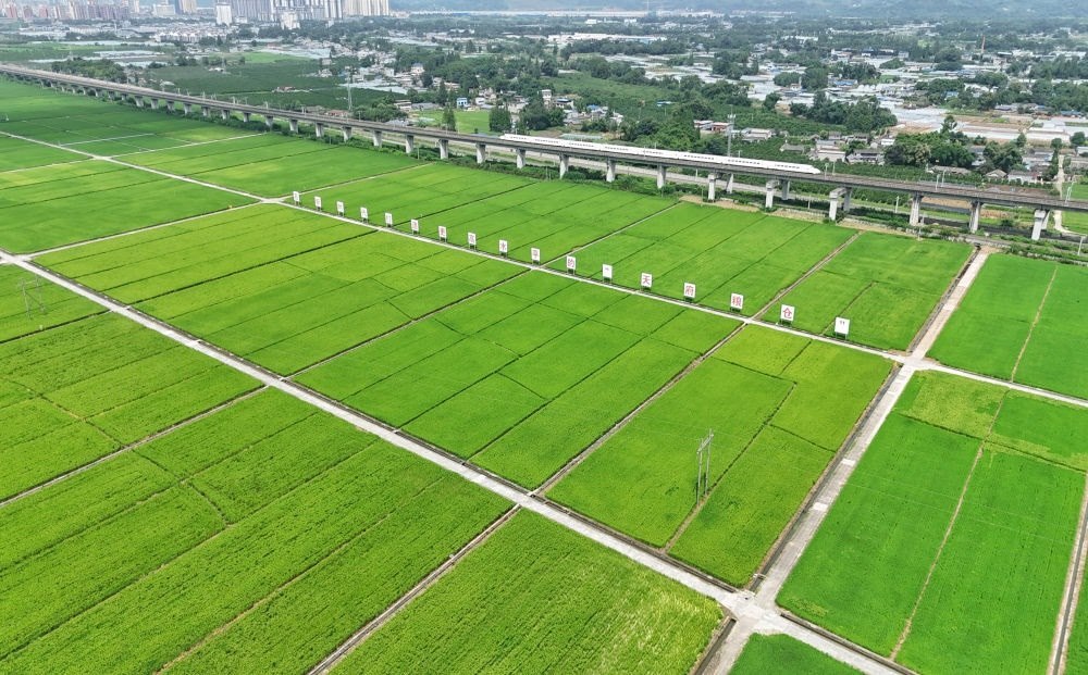 2024年7月26日,一列高鐵列車從永豐村高標(biāo)準(zhǔn)農(nóng)田上方的高架橋上疾馳而過(無人機(jī)照片)。