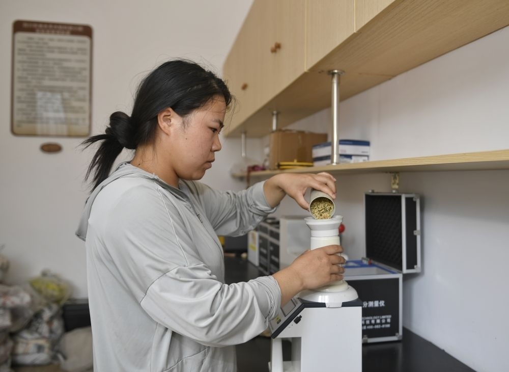 2024年8月22日,在永豐村水稻科技小院,長期駐守在此的四川農(nóng)業(yè)大學(xué)學(xué)生測量稻谷含水量。