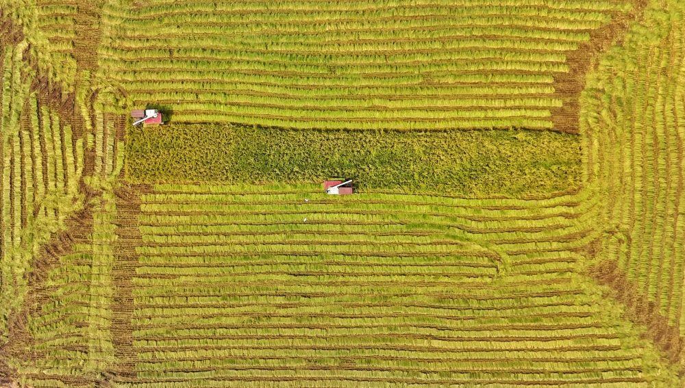 2024年8月22日,收割機(jī)在永豐村高標(biāo)準(zhǔn)農(nóng)田內(nèi)收割水稻(無人機(jī)照片)。