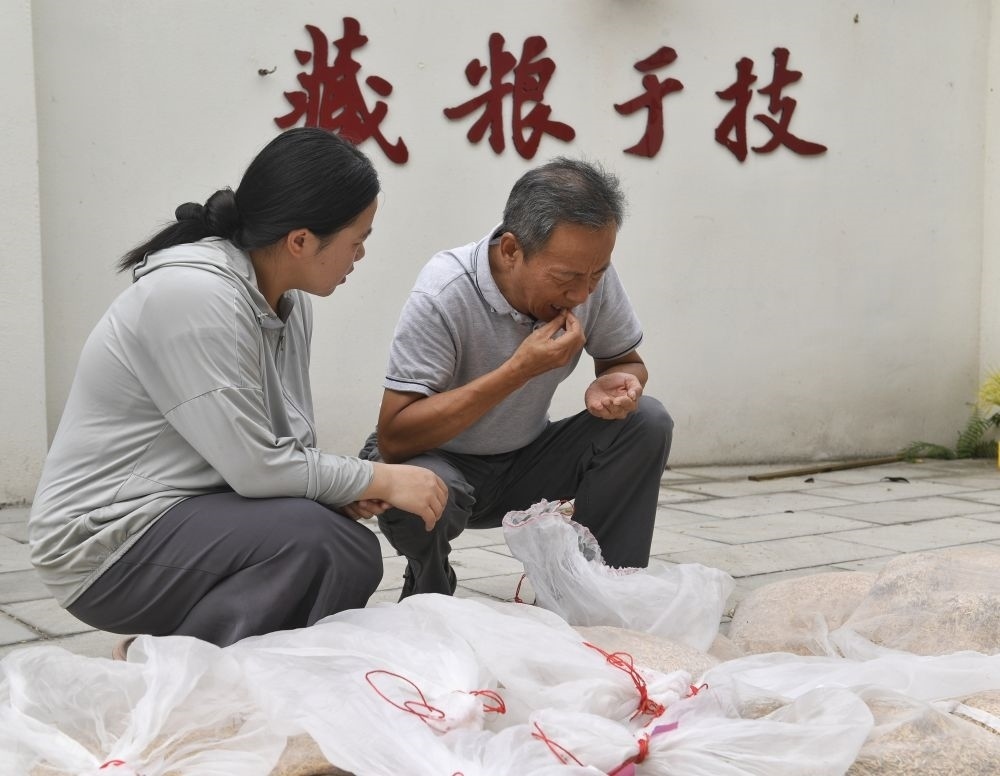 2024年9月10日,農(nóng)業(yè)專家、四川農(nóng)業(yè)大學(xué)教授馬均(右)在永豐村水稻科技小院通過牙咬感受稻谷晾曬程度。