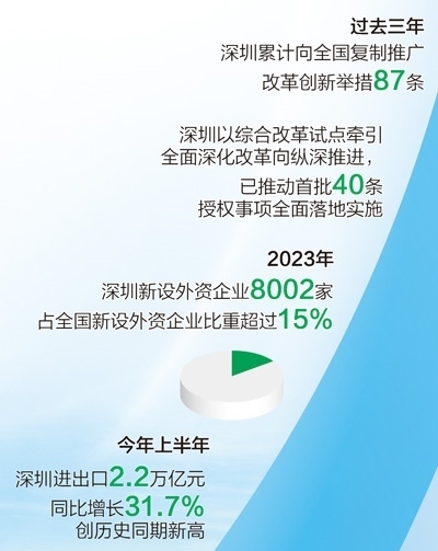 改革開放釋放澎湃動能。深圳發(fā)布支持外商投資生物醫(yī)藥領(lǐng)域、實施跨境貿(mào)易投資高水平開放政策試點等20條措施,出臺優(yōu)化國際化營商環(huán)境工作方案,持續(xù)提升對全球優(yōu)質(zhì)要素資源的強大吸引力。去年全年,深圳新設(shè)外資企業(yè)8002家,占全國新設(shè)外資企業(yè)比重超過15%;今年上半年,深圳進出口總額2.2萬億元,同比增長31.7%,創(chuàng)深圳歷史同期新高。