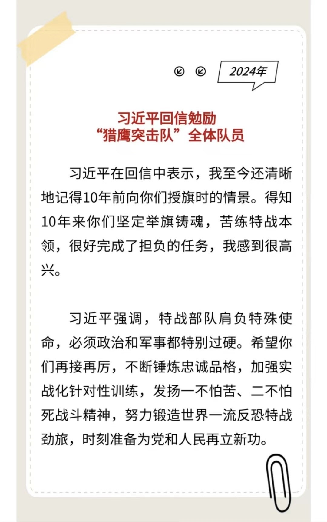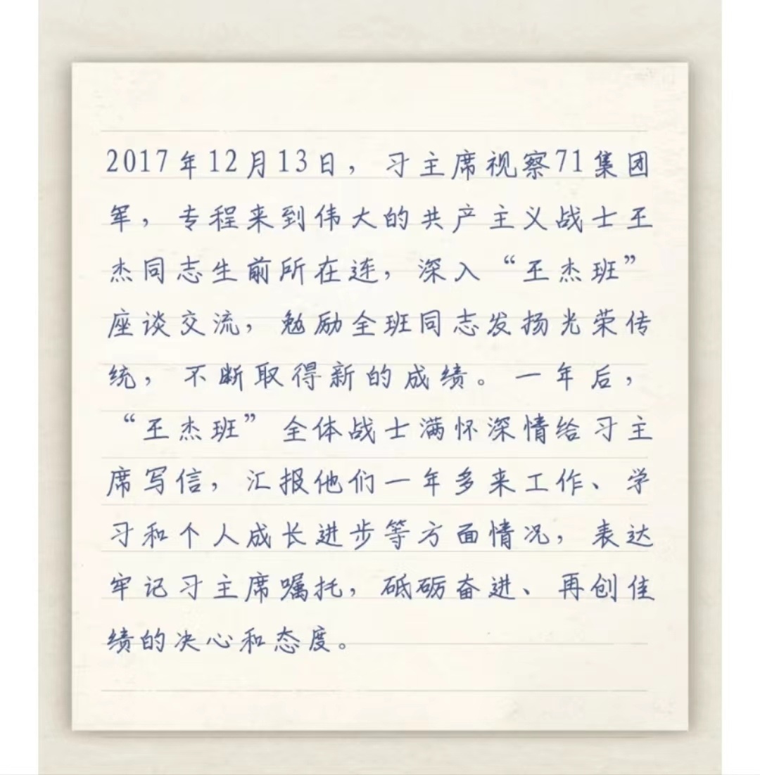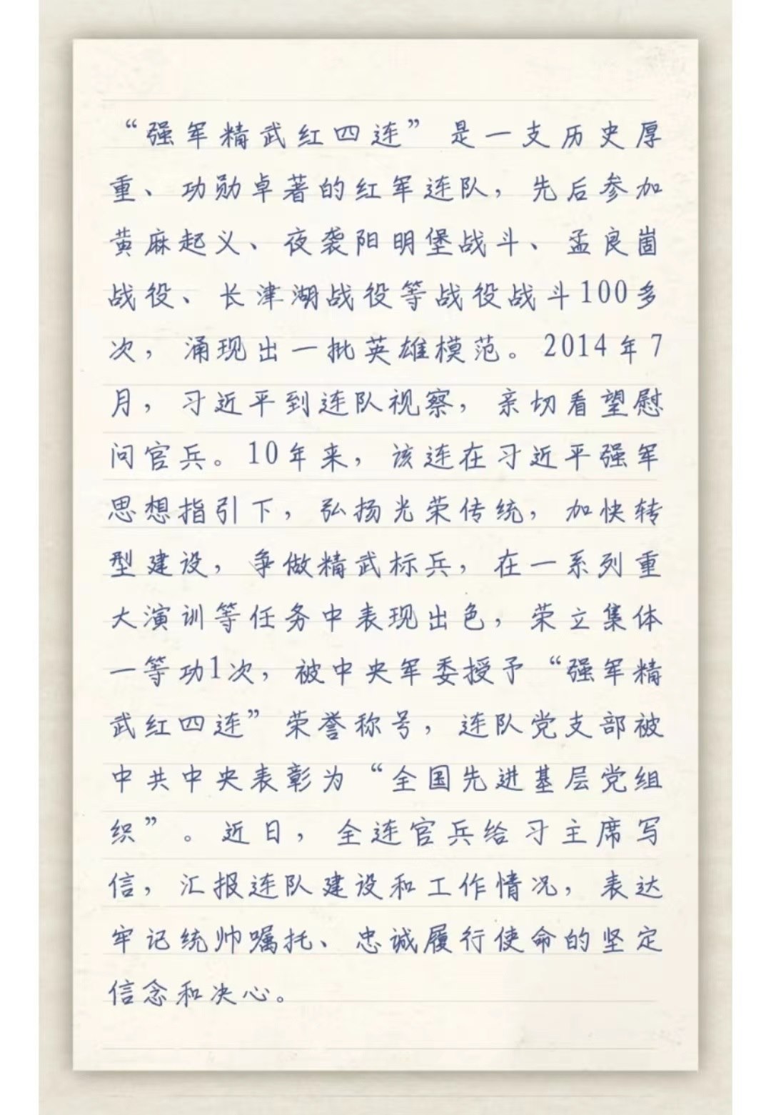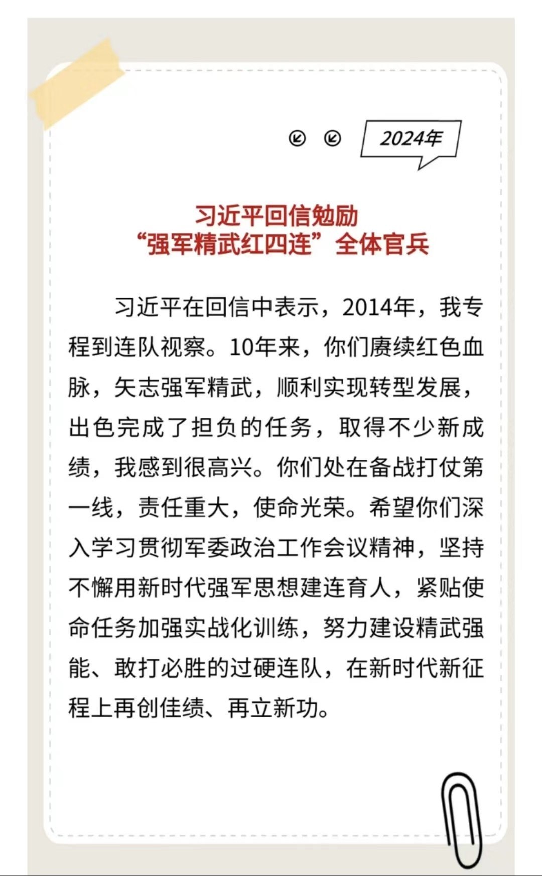 習主席給“強軍精武紅四連”全體官兵回信