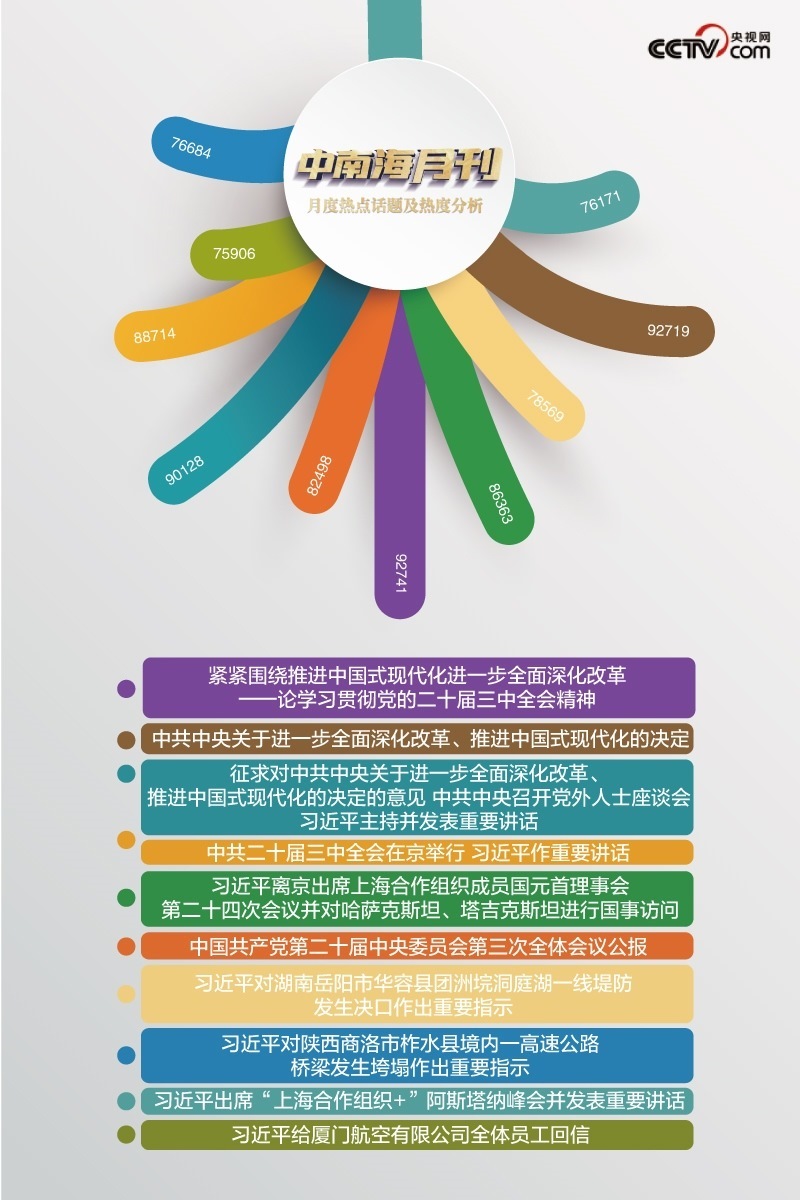 央視網(wǎng)“智聞”系統(tǒng)提取分析2024年7月全網(wǎng)時政新聞熱點顯示,本月“中共中央關(guān)于進一步全面深化改革、推進中國式現(xiàn)代化的決定”“中共二十屆三中全會在京舉行 習(xí)近平作重要講話”等話題備受關(guān)注。