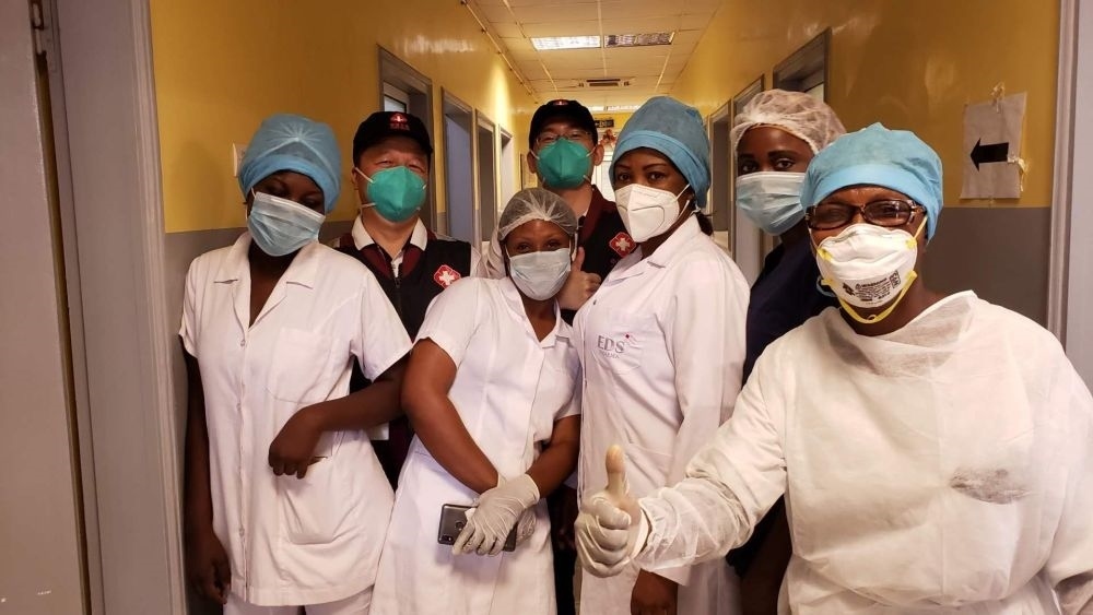2020年5月26日,在剛果(布)首都布拉柴維爾,中國(guó)抗疫醫(yī)療專家組與當(dāng)?shù)匾痪€醫(yī)務(wù)人員交流,指導(dǎo)新冠肺炎病房建設(shè)。