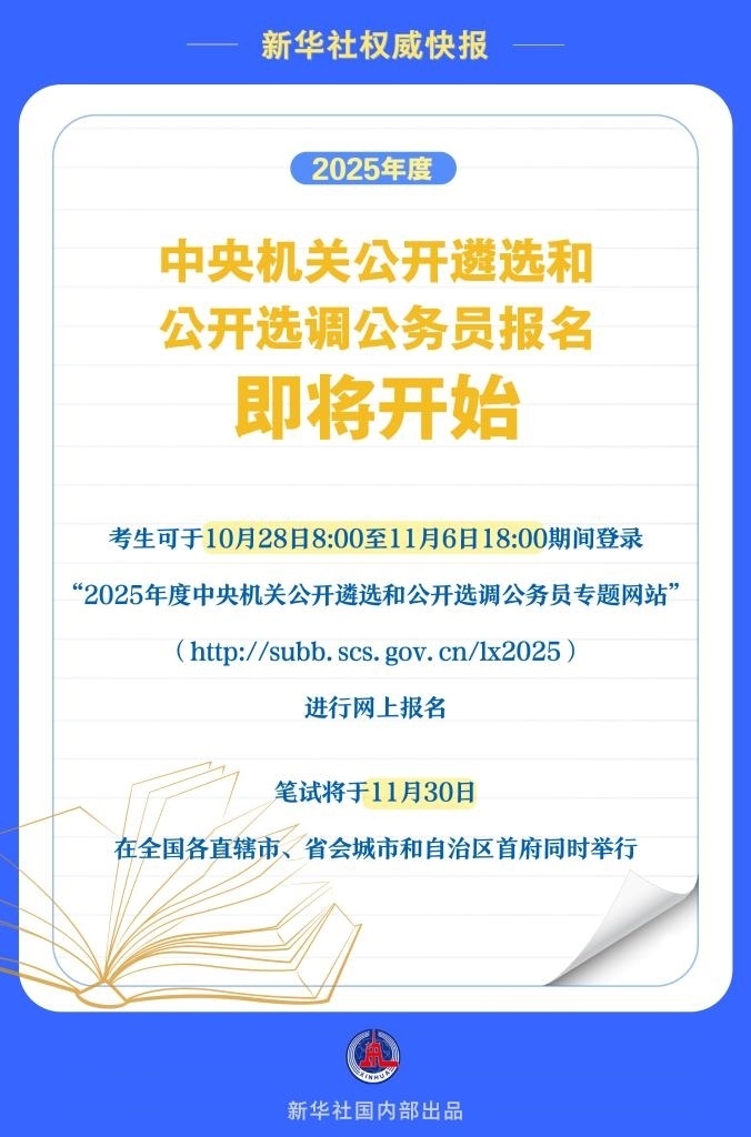 新華社北京10月27日電記者27日從國家公務(wù)員局獲悉,2025年度中央機(jī)關(guān)公開遴選和公開選調(diào)公務(wù)員報(bào)名即將開始,考生可于10月28日8:00至11月6日18:00期間,登錄“2025年度中央機(jī)關(guān)公開遴選和公開選調(diào)公務(wù)員專題網(wǎng)站”(http://subb.scs.gov.cn/lx2025)進(jìn)行網(wǎng)上報(bào)名,筆試將于11月30日在全國各直轄市、省會(huì)城市和自治區(qū)首府同時(shí)舉行。