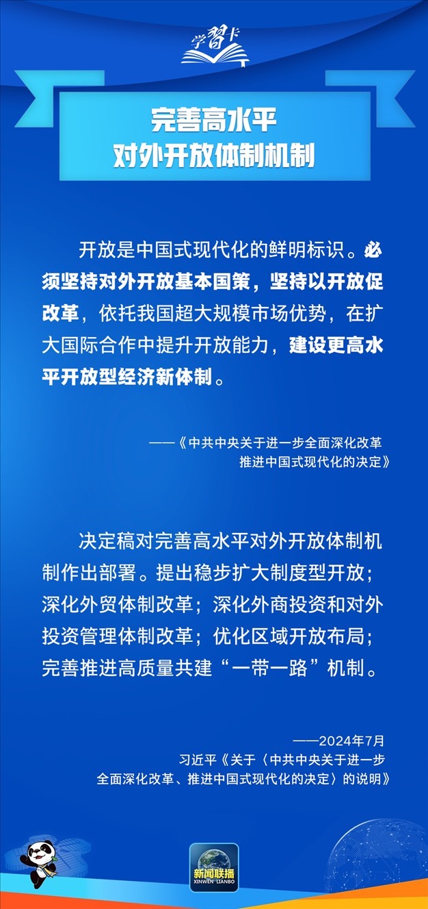 今年7月,黨的二十屆三中全會(huì)審議通過《中共中央關(guān)于進(jìn)一步全面深化改革 推進(jìn)中國式現(xiàn)代化的決定》。這份綱領(lǐng)性文件明確提出,“完善高水平對(duì)外開放體制機(jī)制”。