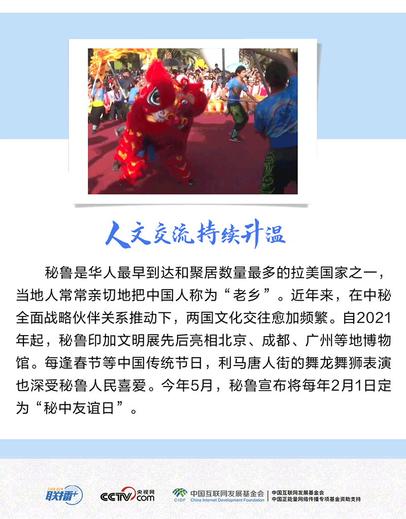 中國和秘魯都是文明古國,兩國友誼源遠流長,人民友好深入人心。習近平主席曾以“秘魯是中國在太平洋對岸的‘鄰居’”形容中秘關(guān)系,生動詮釋了兩國和兩國人民之間“相知無遠近”的深厚友誼。