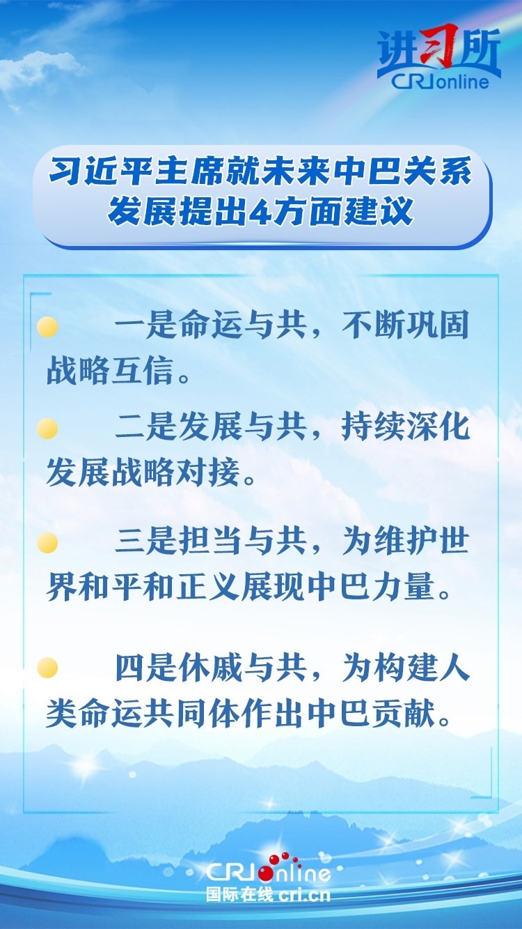 今年是中巴建交50周年。習近平指出,回首過去50年,中巴關(guān)系跨越山海,探索出發(fā)展中大國相互尊重、互利友好、合作共贏的正確相處之道。中方愿同巴方一道,以人類前途為懷、以人民福祉為念,不斷豐富新時代中巴關(guān)系內(nèi)涵,做相互成就的“黃金搭檔”,朝著構(gòu)建人類命運共同體、構(gòu)建更公正世界和更可持續(xù)星球的目標不斷邁進,為人類和平和進步事業(yè)作出更大貢獻。