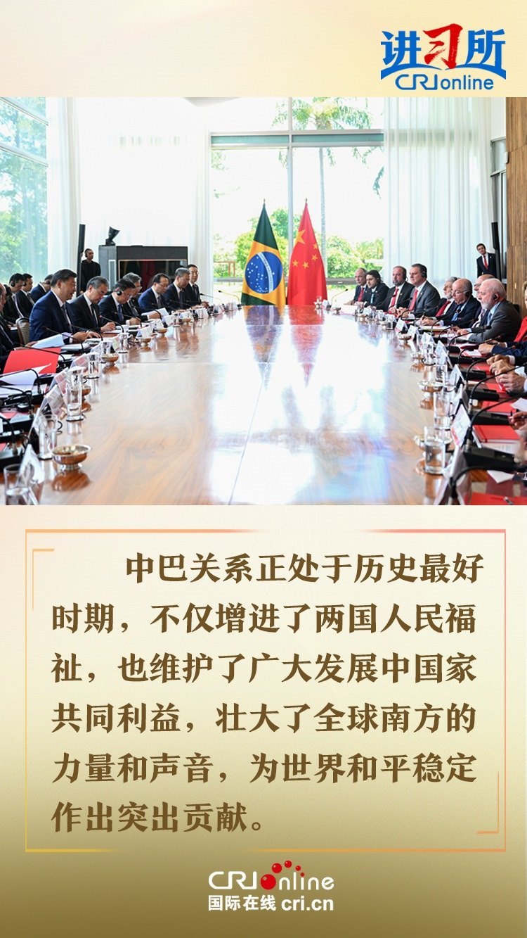 當?shù)貢r間11月20日,中國國家主席習近平在巴西利亞總統(tǒng)官邸黎明宮同巴西總統(tǒng)盧拉舉行會談。兩國元首宣布,將中巴關(guān)系定位提升為攜手構(gòu)建更公正世界和更可持續(xù)星球的中巴命運共同體。