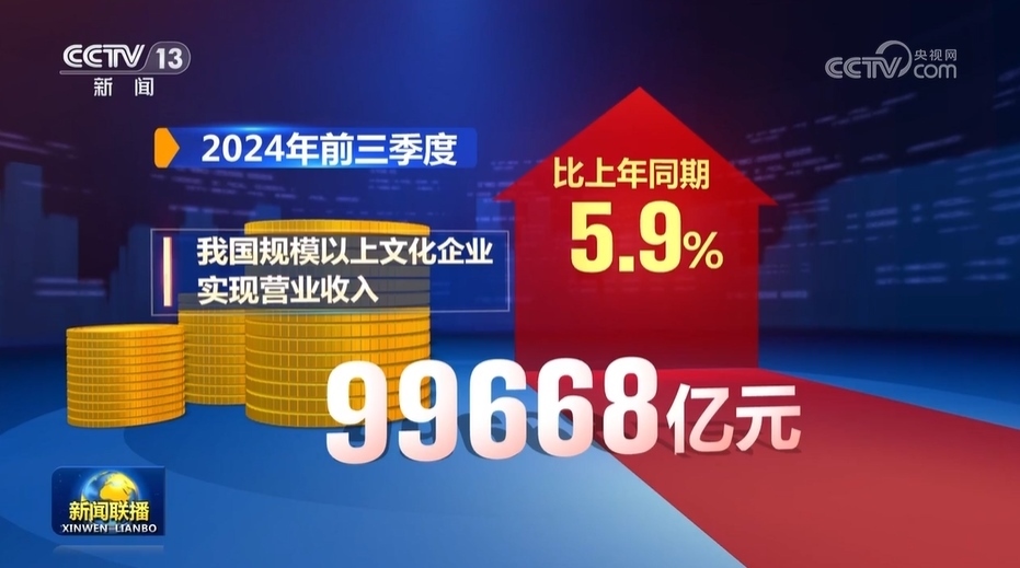 數(shù)據(jù)顯示,今年前三季度,我國規(guī)模以上文化企業(yè)實現(xiàn)營業(yè)收入99668億元,比上年同期增長5.9%。其中,文化新業(yè)態(tài)行業(yè)實現(xiàn)營業(yè)收入41616億元,比上年同期增長10.0%。