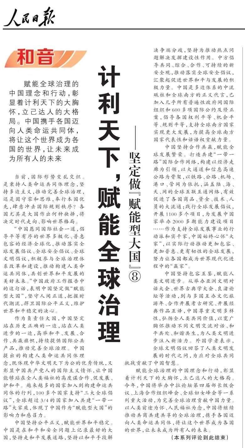 近期,《人民日報》“和音”欄目推出“堅定做‘賦能型大國’”系列評論,圍繞科技創(chuàng)新、開放共贏、綠色轉(zhuǎn)型、高質(zhì)量共建“一帶一路”、多邊治理等熱點議題,從不同角度闡釋中國何以成為一個“賦能型大國”的深層邏輯,展現(xiàn)中國始終秉持構(gòu)建人類命運共同體理念,不斷以中國式現(xiàn)代化為世界現(xiàn)代化賦能的大國擔(dān)當(dāng)。