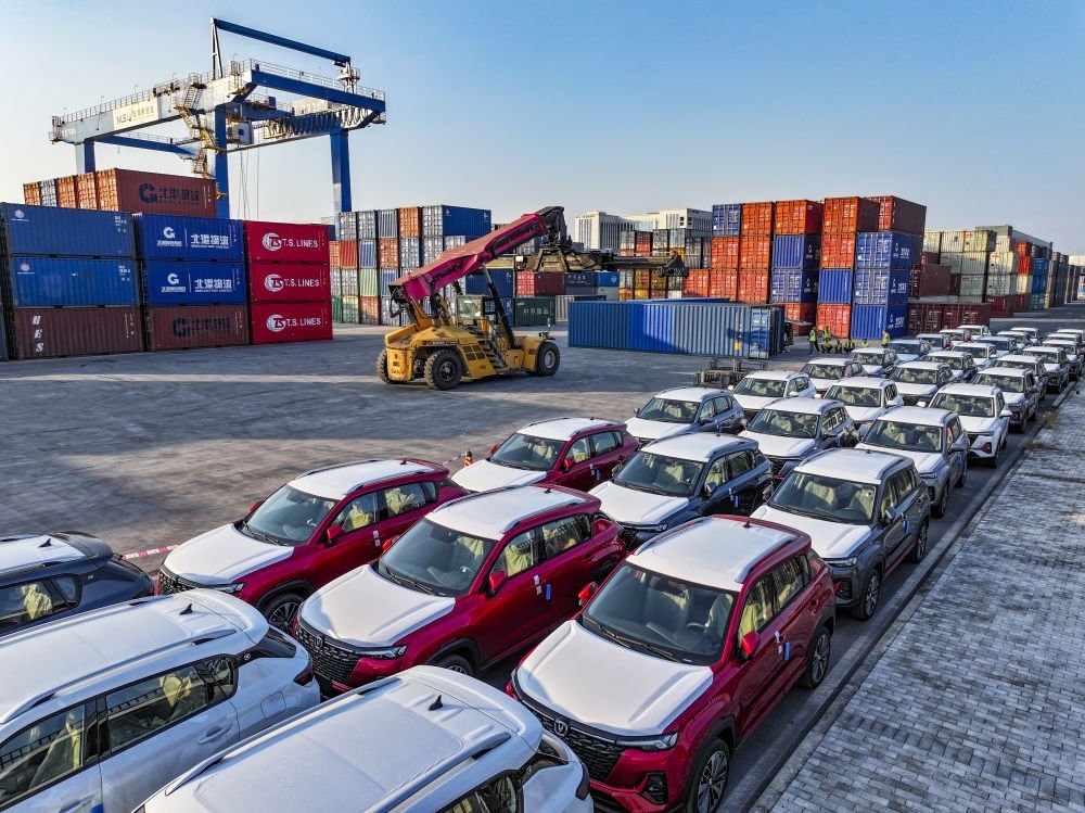 2024年10月28日在重慶國(guó)際物流樞紐園區(qū)西部陸海新通道重慶無(wú)水港拍攝的出口汽車(chē)裝運(yùn)現(xiàn)場(chǎng)(無(wú)人機(jī)照片)。位于重慶市沙坪壩區(qū)的重慶國(guó)際物流樞紐園區(qū),是重慶中歐班列、西部陸海新通道班列、渝滿俄班列、渝甬班列的主要到發(fā)點(diǎn),截至2024年10月,已開(kāi)通班列線路62條,輻射125個(gè)國(guó)家和地區(qū)的542個(gè)港口。