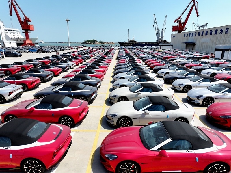 6月16日,在江蘇省連云港港東方港務(wù)分公司碼頭,大批車輛等待裝船外運(yùn)(無(wú)人機(jī)照片)。5月份,貨物進(jìn)出口總額38098億元,同比增長(zhǎng)2.7%。
