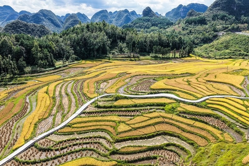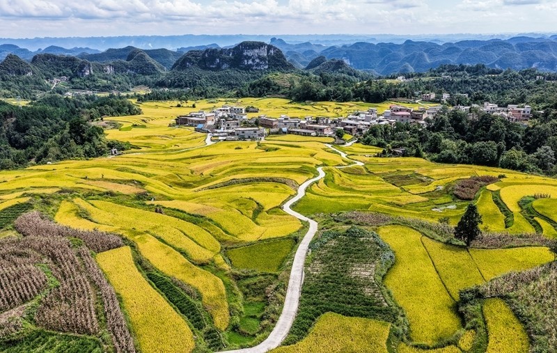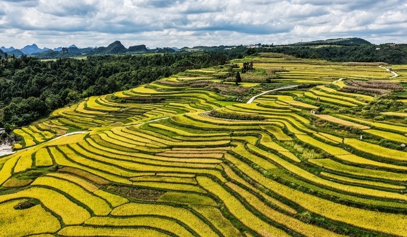 長(zhǎng)順縣長(zhǎng)寨街道擺塘梯田風(fēng)光(9月17日攝,無(wú)人機(jī)照片)。