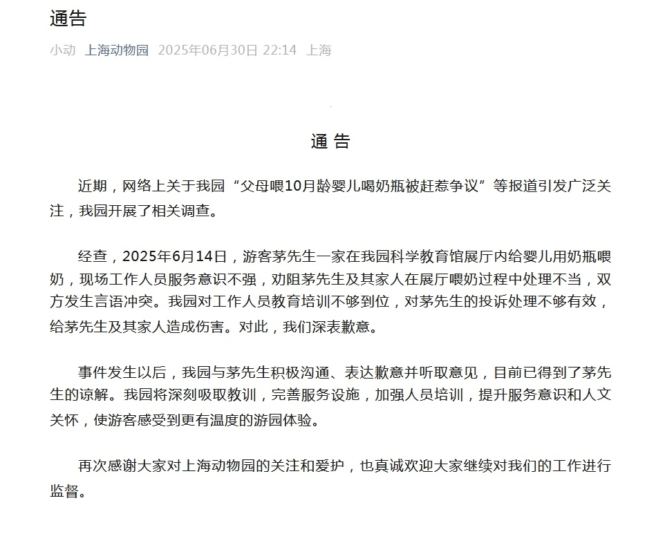 《通告》中稱,經(jīng)查,2025年6月14日,游客茅先生一家在該動(dòng)物園科學(xué)教育館展廳內(nèi)給嬰兒用奶瓶喂奶,現(xiàn)場(chǎng)工作人員服務(wù)意識(shí)不強(qiáng),勸阻茅先生及其家人在展廳喂奶過(guò)程中處理不當(dāng),雙方發(fā)生言語(yǔ)沖突。對(duì)工作人員教育培訓(xùn)不夠到位,對(duì)茅先生的投訴處理不夠有效,給茅先生及其家人造成傷害。對(duì)此,上海動(dòng)物園深表歉意。
