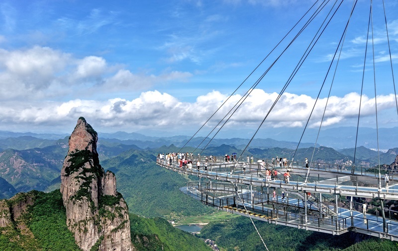 7月5日,游客在浙江省臺州市仙居縣神仙居景區(qū)南天頂玻璃觀景臺上游玩(無人機照片)。