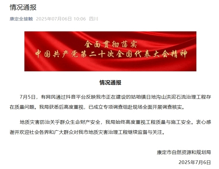 中新網(wǎng)7月6日電 據(jù)“康定全接觸”微信公眾號(hào)消息,7月5日,有網(wǎng)民通過(guò)抖音平臺(tái)反映四川省康定市正在建設(shè)的姑咱鎮(zhèn)日地溝山洪泥石流治理工程存在質(zhì)量問(wèn)題??刀ㄊ凶匀毁Y源和規(guī)劃局獲悉后高度重視,已成立專項(xiàng)調(diào)查組赴現(xiàn)場(chǎng)全面開(kāi)展調(diào)查核實(shí)。