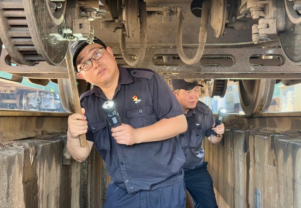 只見他俯下身鉆入車底,仔細(xì)檢查車輛的轉(zhuǎn)向架、制動裝置等關(guān)鍵部位。車底空間狹小、光線不足,許立業(yè)需借助手電筒弓著腰作業(yè),不一會兒,汗水就浸濕了工作服。為了預(yù)防中暑,他掏出一瓶藿香正氣水,一口氣喝完,然后擦了擦臉上的汗水,繼續(xù)朝下節(jié)車廂走去。