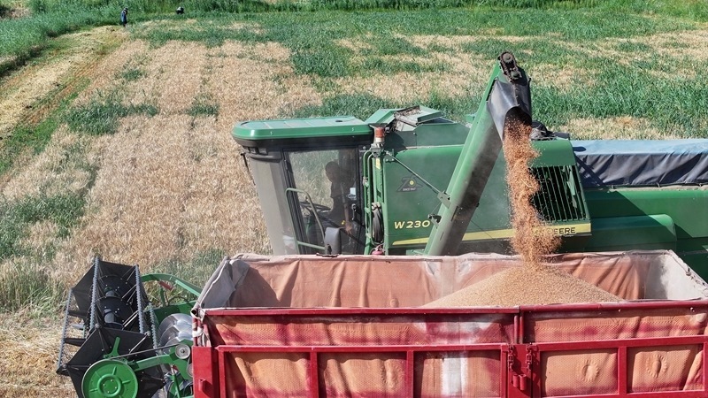 7月15日,收割機(jī)在銀川市賀蘭縣立崗鎮(zhèn)蘭星村收獲小麥。
