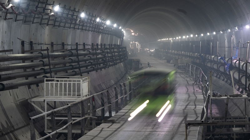 7月16日,工程車輛行駛在貫通的隧道內(nèi)。