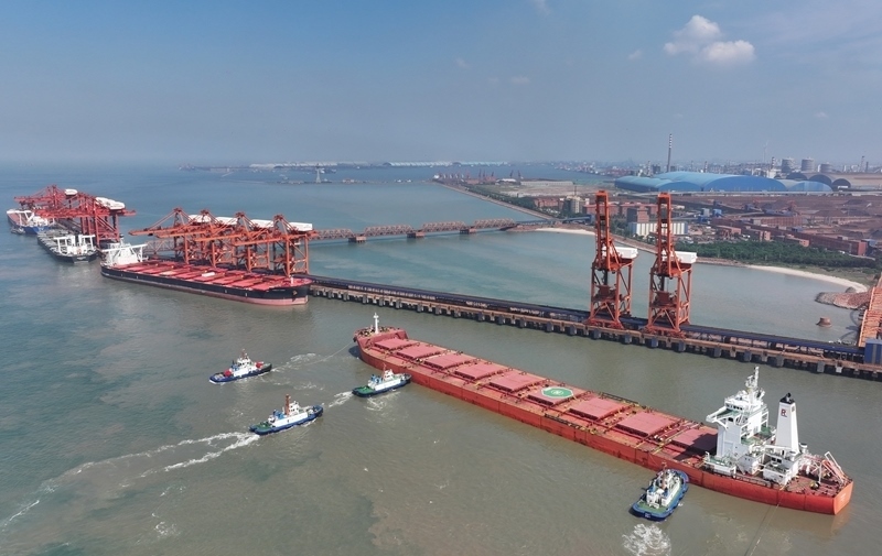 7月18日,輪船在拖輪的協(xié)助下向唐山港曹妃甸港區(qū)礦石碼頭靠泊(無人機照片)。