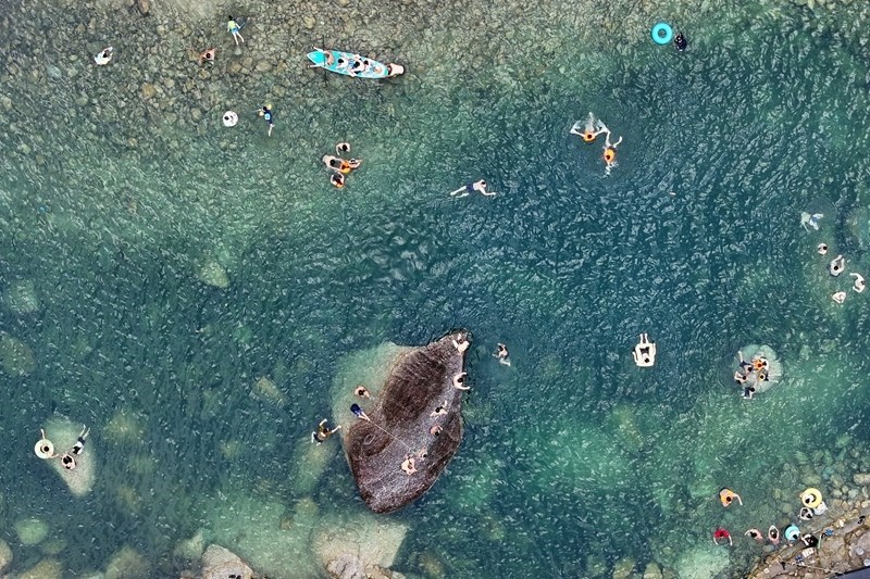 游客在融水苗族自治縣香粉鄉(xiāng)雨卜村戲水消暑(7月19日攝,無人機照片)。