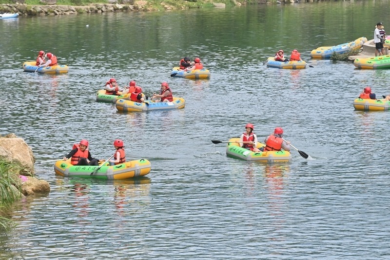 游客在融水苗族自治縣香粉鄉(xiāng)雨卜村漂流消暑(7月20日攝)。