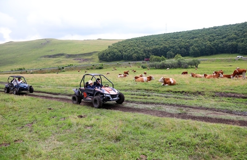 7月24日,游客在內(nèi)蒙古自治區(qū)赤峰市克什克騰旗草原駕乘草地車(chē)。