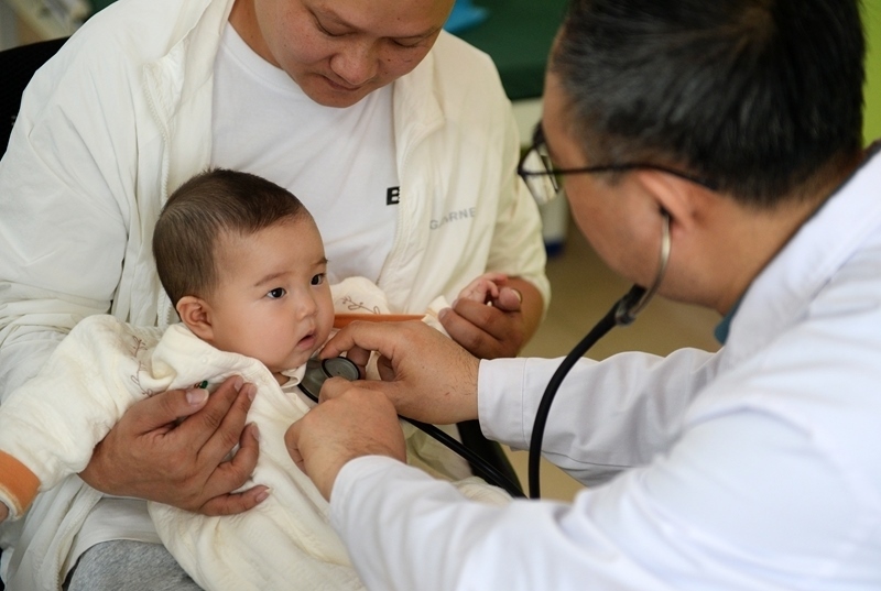 在貴陽市觀山湖區(qū)婦幼保健院,參加“天使之旅——先心病患兒篩查救助行動”的山東第一醫(yī)科大學附屬中心醫(yī)院醫(yī)療專家在為孩子做檢查(2025年4月22日攝)。新華社記者 劉勇貞 攝