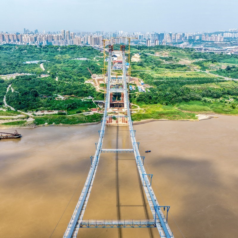 當日,由重慶城投集團投資、城投建設公司組織建設、中國鐵建大橋局承建的黃桷沱長江大橋順利完成主纜架設工作,標志著大橋建設即將進入鋼桁梁吊裝工序。黃桷沱長江大橋全長1260米,主跨765米,為單跨懸吊雙塔三跨連續(xù)鋼桁梁懸索橋,是國內(nèi)最大跨徑公軌兩用懸索橋。黃桷沱長江大橋是渝長高速復線連接道工程的控制性節(jié)點工程,建成后將成為聯(lián)系重慶主城區(qū)長江南北兩岸的重要交通干道。