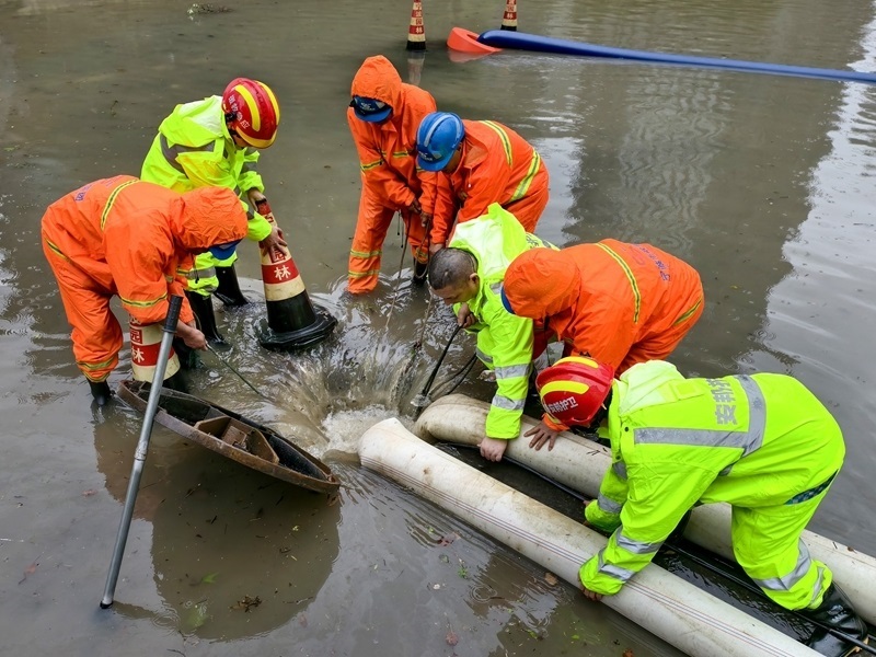 7月30日,浙江省寧波市市政園林等部門(mén)救援人員協(xié)同排除道路積水。