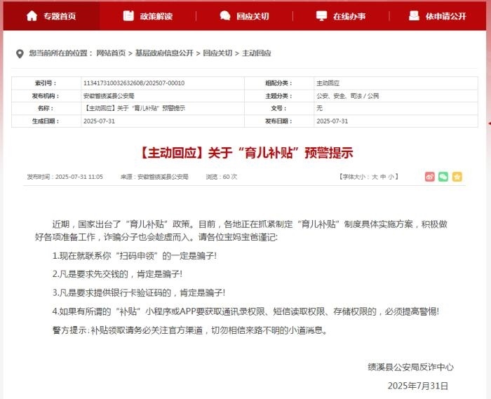 安徽績溪縣公安局7月31日發(fā)布關(guān)于育兒補(bǔ)貼的預(yù)警提示。