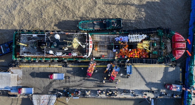 近日,東海部分海域結(jié)束為期3個(gè)月的伏季休漁期,浙江舟山市申請(qǐng)了專項(xiàng)捕撈特許的漁船結(jié)束休漁,開(kāi)赴東海海域進(jìn)行捕撈作業(yè)。漁運(yùn)船和漁船一同抵達(dá)作業(yè)漁場(chǎng),捕撈上來(lái)的海產(chǎn)品由漁運(yùn)船先行送回港口碼頭,漁船則留在海上繼續(xù)生產(chǎn)。