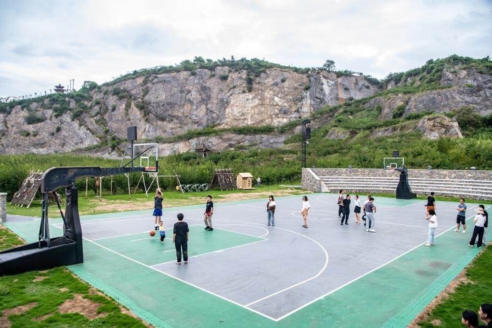 8月16日,在重慶市北碚區(qū)靜觀鎮(zhèn)中華村,游客在礦坑修復(fù)改造的運(yùn)動場內(nèi)打球。新華社記者 唐奕 攝