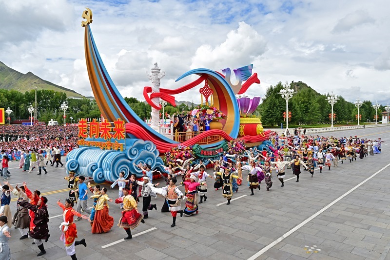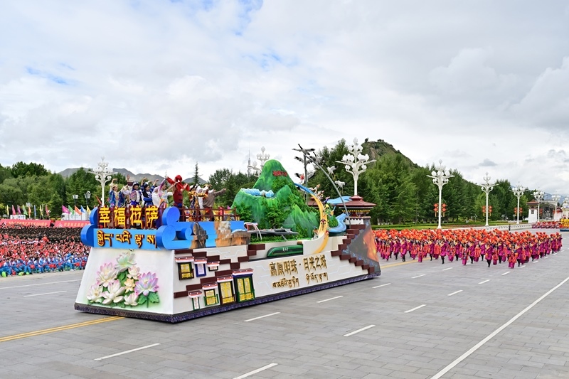 8月21日上午,西藏各族各界干部群眾約2萬人歡聚拉薩市布達(dá)拉宮廣場,熱烈慶祝西藏自治區(qū)成立60周年。這是游行的彩車通過布達(dá)拉宮廣場。