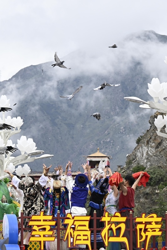 8月21日上午,西藏各族各界干部群眾約2萬人歡聚拉薩市布達(dá)拉宮廣場,熱烈慶祝西藏自治區(qū)成立60周年。這是彩車上的演員通過布達(dá)拉宮廣場時(shí)放飛鴿子。