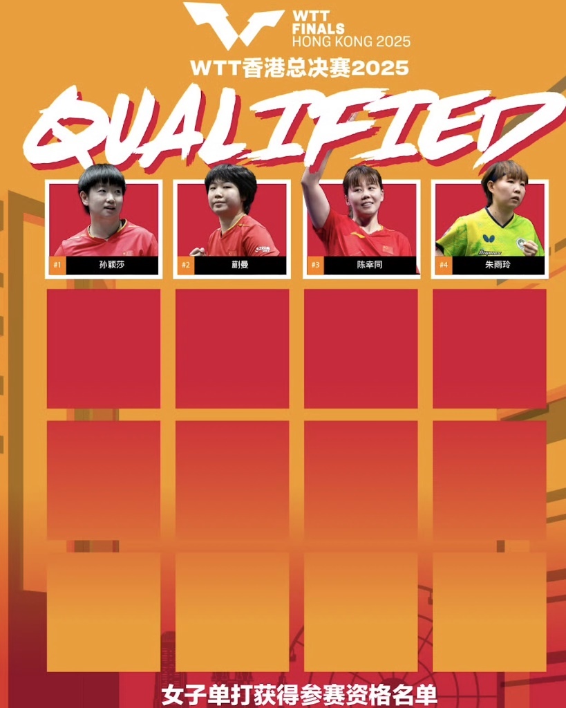 中國隊(duì)孫穎莎、蒯曼、陳幸同及中國澳門隊(duì)的朱雨玲獲得WTT香港總決賽女子單打參賽資格。圖片來自WTT世界乒聯(lián)官方微博