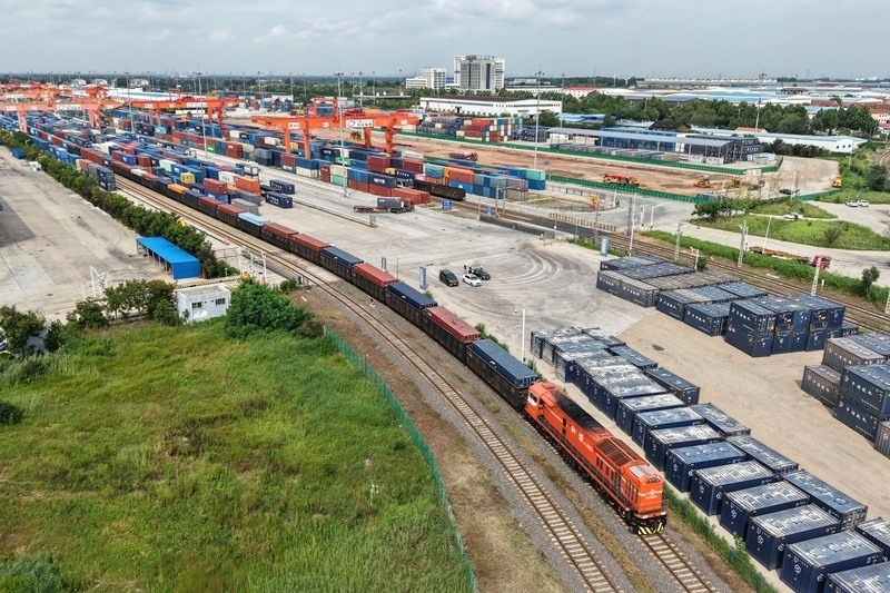 8月27日,貨運列車駛?cè)胛挥谏虾鲜痉秴^(qū)內(nèi)的中國-上海合作組織地方經(jīng)貿(mào)合作示范區(qū)多式聯(lián)運中心(無人機照片)。