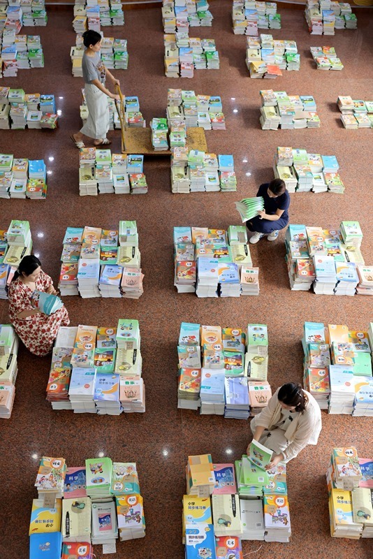8月30日,山東省棗莊市市中區(qū)文化路小學老師在清點新學期教材。