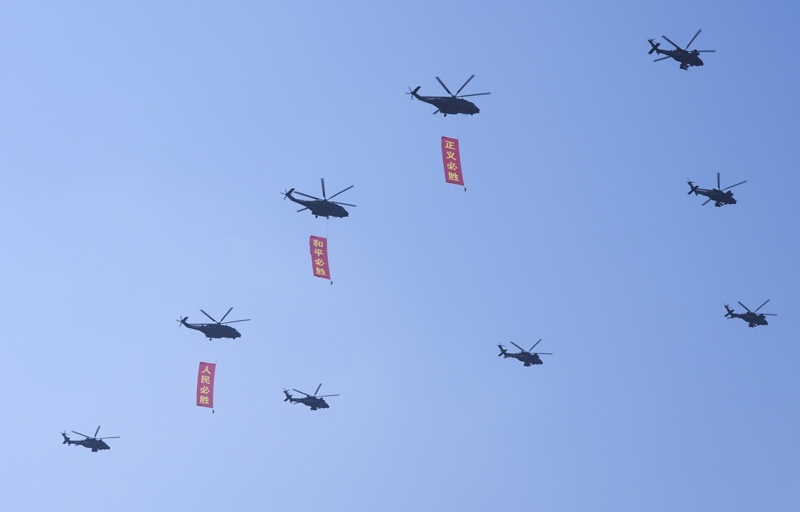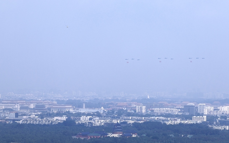 9月3日,紀(jì)念中國(guó)人民抗日戰(zhàn)爭(zhēng)暨世界反法西斯戰(zhàn)爭(zhēng)勝利80周年大會(huì)在北京隆重舉行。這是空中護(hù)旗梯隊(duì)。