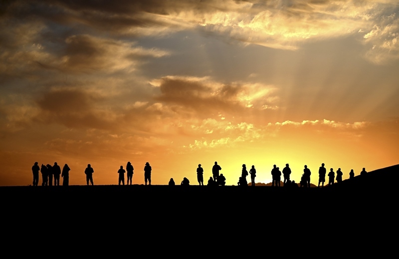 10月2日清晨,游客在甘肅省敦煌市鳴沙山月牙泉景區(qū)觀賞大漠日出美景。