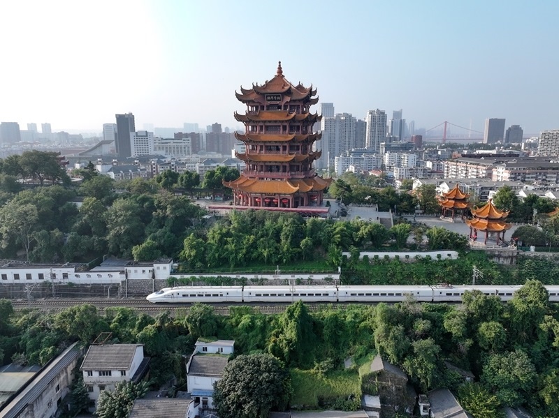 10月10日,動(dòng)車組列車經(jīng)過湖北省武漢市黃鶴樓(無人機(jī)照片)。