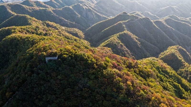 10月18日在河北省唐山市遷西縣上營(yíng)鎮(zhèn)拍攝的青山關(guān)長(zhǎng)城秋景(無人機(jī)照片)。