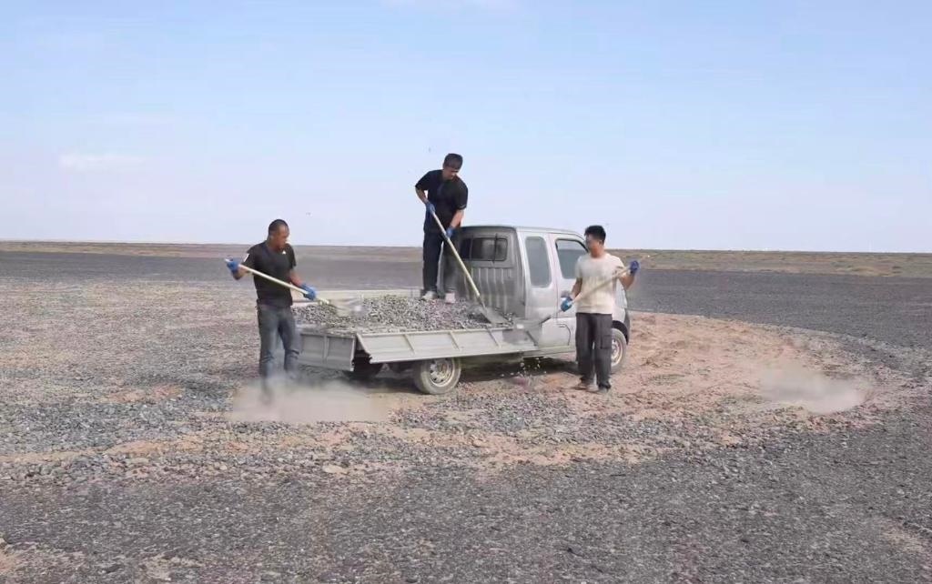 “看到車輪碾過標(biāo)語那一刻,就像碾在歷史的脊梁上?!本W(wǎng)絡(luò)博主陸遙得知標(biāo)語被破壞后,主動驅(qū)車兩千多公里,經(jīng)歷六天抵達(dá)哈密。他和朋友們拉運20噸砂石,才終于修復(fù)這些“疤痕”。