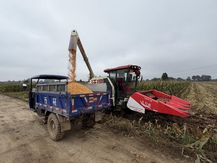 圖為一臺履帶式聯(lián)合收割機(jī)在陜西省武功縣長寧鎮(zhèn)一處糧田完成收割后將玉米倒入運(yùn)糧車。新華社記者劉彤 攝