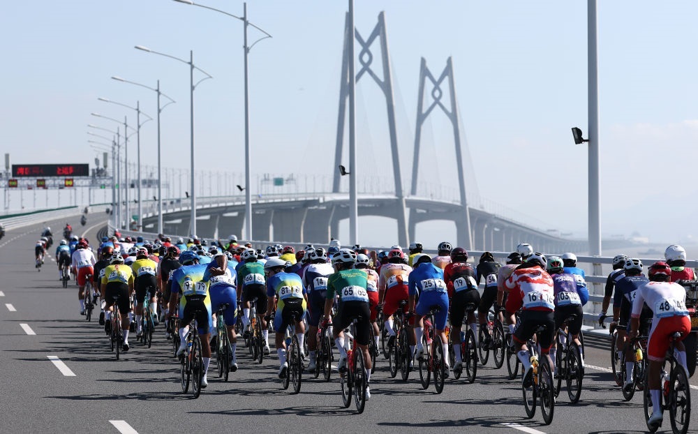 11月8日,參賽選手在港珠澳大橋騎行。當(dāng)日進(jìn)行的第十五屆全國(guó)運(yùn)動(dòng)會(huì)公路自行車男子個(gè)人賽,賽道全程231.8公里,選手經(jīng)過港珠澳大橋,跨越粵港澳三地。這是全運(yùn)會(huì)歷史上首次舉辦跨境比賽。新華社記者 毛思倩 攝