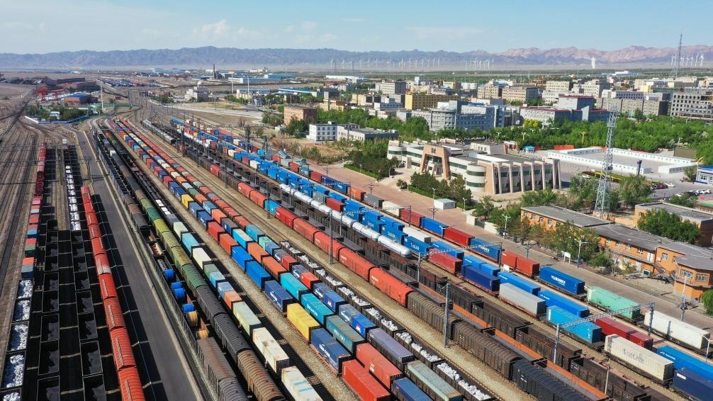 在新疆阿拉山口站寬準(zhǔn)軌編組場,出入境中歐班列集結(jié)等待出發(fā)(2024年5月25日攝,無人機照片)。新華社發(fā)(于暉 攝)
