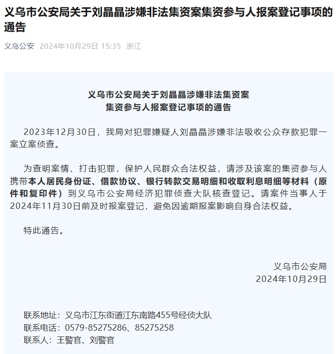 此前義烏公安也有在通告中公布嫌疑人全名的情況,例如2024年12月30日,其曾發(fā)布“關(guān)于劉晶晶涉嫌非法集資案集資參與人報(bào)案登記事項(xiàng)的通告”,亦是非法集資案,同樣公布嫌疑人全名。